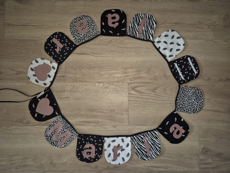 Stoffen slinger met halfronde vlaggetjes en naam in kunstleer (zelf samenstellen)