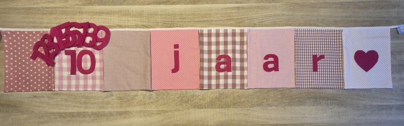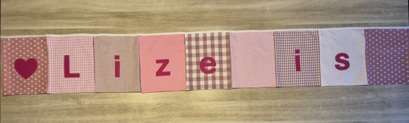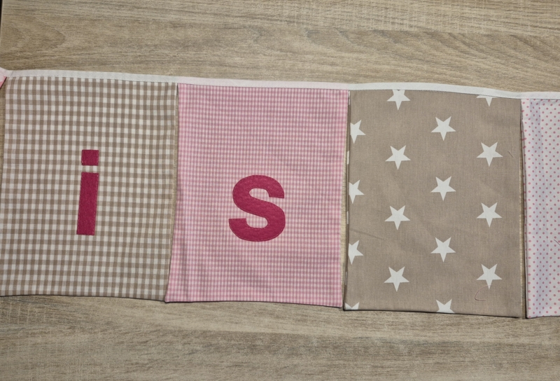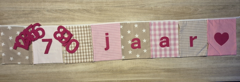 Een vlaggenslinger van diverse stoffen in 2 kleuren met een naam in vilten letters erop. Beide in een kleur naar keuze. Ook kun je kiezen om de start- en eindvlag leeg te laten of er een hart of ster op te laten appliceren. Een slinger start met 4 vlaggetjes en kan uitgebreid worden met een aantal vlaggetjes naar keuze.
