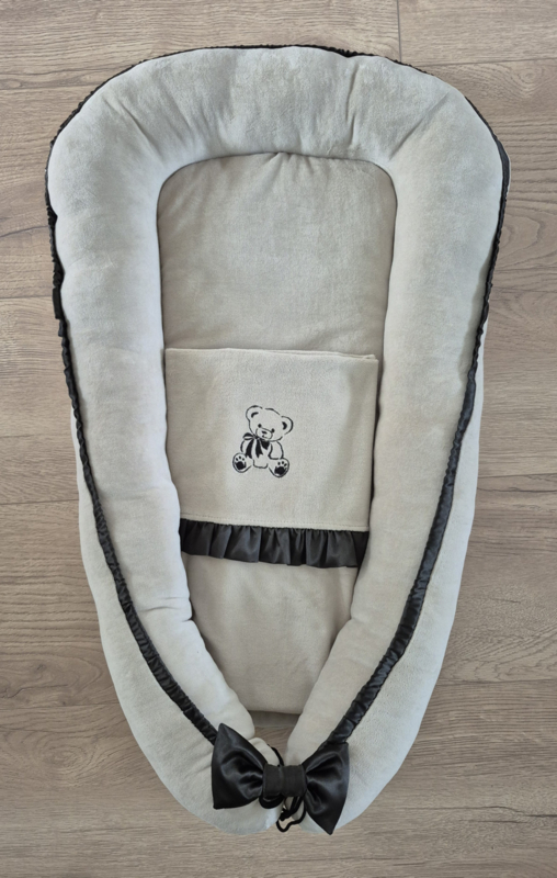 Een schattig babynestje gemaakt van nicky velours, beide zijden in een kleur naar keuze. De bies en de strik worden van satijn gemaakt in een kleur naar keuze.