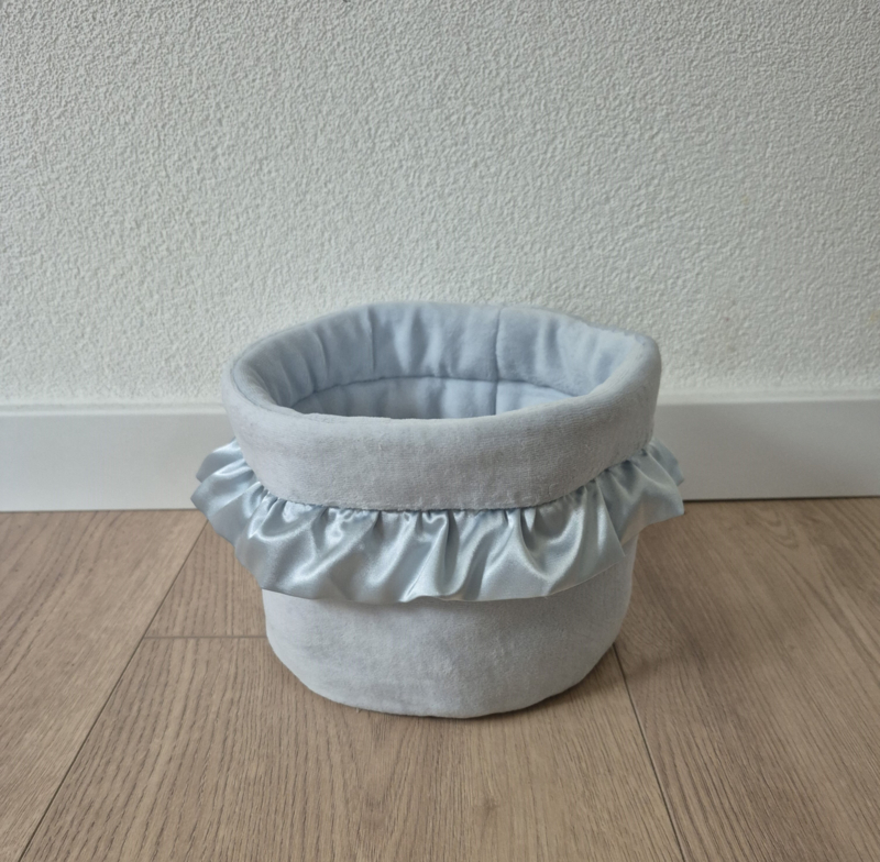 OverzichtEen handig en decoratief commodemandje van nicky velours in combinatie met satijn. Deze heeft een doorsnede van circa 15 cm.