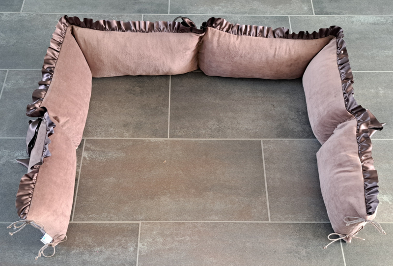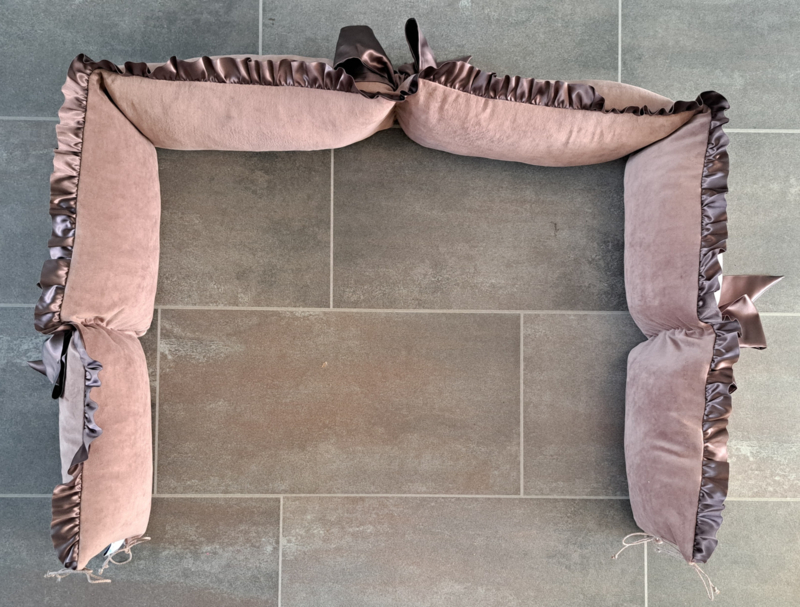 OverzichtEen boxrand die je kindje bescherming bied, de rand is circa 25 cm hoog inclusief ruche. De rand is gemaakt van nicky velours en heeft een ruche van satijn. Beide in een kleur naar keuze. Aan de rand zitten 3 strikken om de rand mee aan de box vast te zetten. Er zijn ook bijpassende artikelen verkrijgbaar zoals een boxkleed.