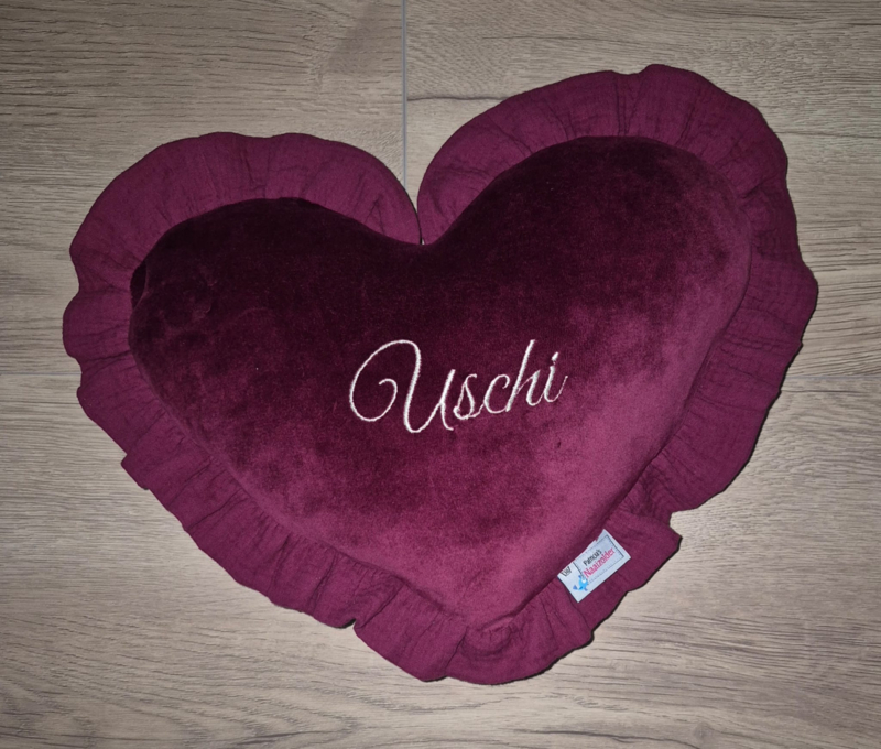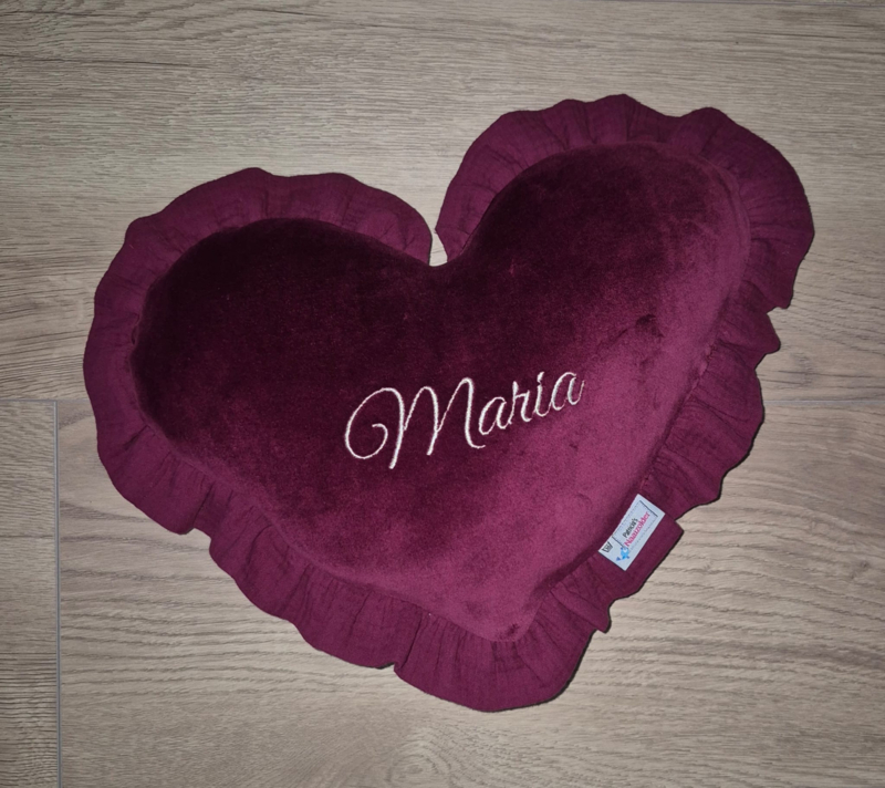 Kussen hart nicky velours met hydrofiele ruche en naam geborduurd