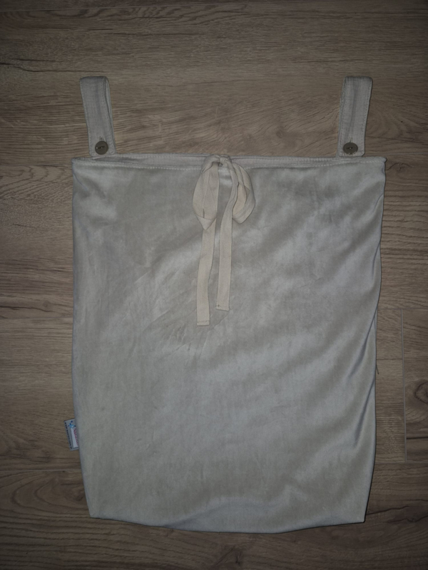 Boxzak wafelkatoen met aantrekkoordEen boxzak gemaakt van wafelkatoen in een kleur naar keuze. Bovenaan de zak 2 lussen met een knoopsluiting om de zak mee aan de box te bevestigen en bovenin de rand een tunnel met koord om de zak te sluiten.