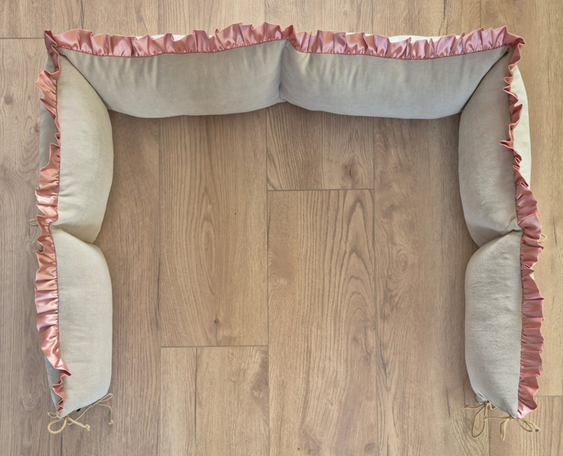 Boxrand kussens 3-zijdig velvet croco met satijnen ruche en koordbevestigingEen boxrand die je kindje bescherming bied, de rand is circa 25 cm hoog inclusief ruche. De rand is gemaakt van velvet croco en heeft een ruche van satijn. Beide in een kleur naar keuze. Aan de rand zitten koordjes om de rand mee…