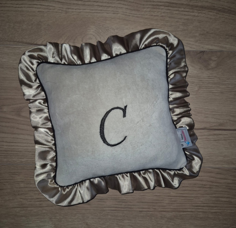 Kussen nicky velours met zwart biesje, satijnen ruche en initiaal geborduurd 25 x 25 cmEen vierkant kussentje van nicky velours met rondom een ruche van satijn en ertussen een zwart biesje. Op het hoesje borduren we een initiaal in een kleur naar keuze.