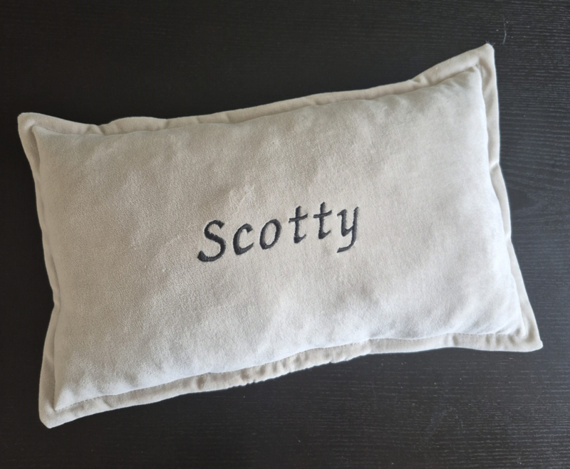 Op het kussen is de naam geborduurd in een kleur naar keuze.